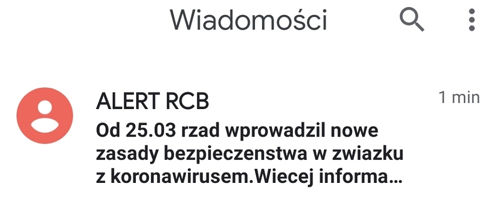 Od środy przypominać o nich będzie za pośrednictwem SMS-ów Rządowe Centrum Bezpieczeństwa. "Dzisiaj został uruchomiony #AlertRCB, skierowany do mieszkańców całej Polski, o treści: Od 25.03 rząd wprowadził nowe zasady bezpieczeństwa w związku z koronawirusem" - napisało Centrum na Twitterze. W smsie rozsyłanym do obywateli znajduje się link do komunikatu RCB, w którym przypomina ono o nowych zasadach bezpieczeństwa.