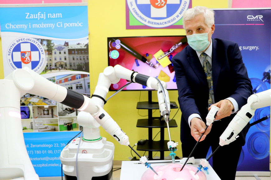 Prezentacja robota chirurgicznego VERSIUS firmy CMR SURGICAL odbyła się w Szpitalu Specjalistycznym w Mielcu. To pierwszy pokaz na Podkarpaciu, wzbudził więc wielkie zainteresowanie, m.in. lekarzy i władz samorządowych. Wziął w nim też udział starosta mielecki, Stanisław Lonczak, wspólnie z członkiem Zarządu Powiatu Mieleckiego Andrzejem Chrabąszczem.