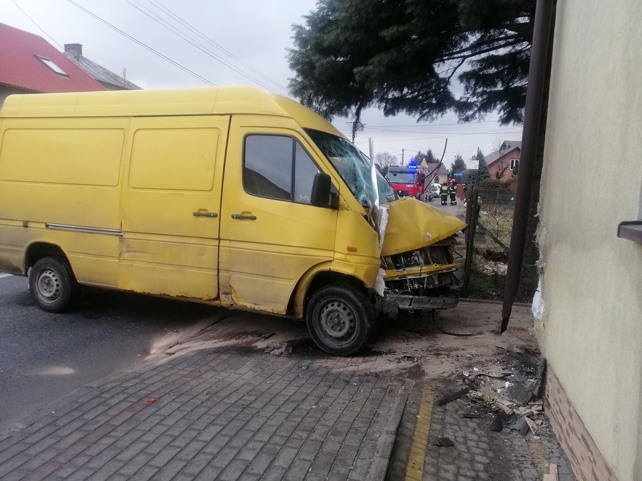 Po zderzeniu samochodu osobowego z dostawczym, kierujący busem wjechał w budynek stojący przy drodze. W wyniku zderzenia dwie osoby potrzebowały pomocy medycznej.