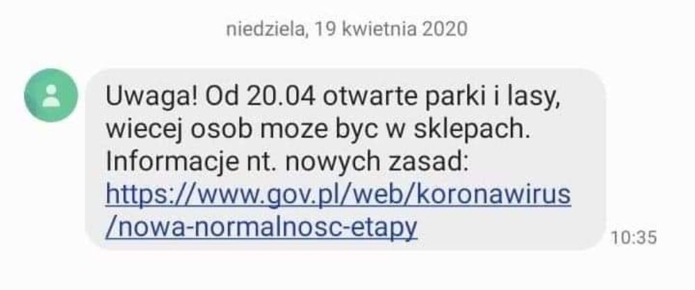 "Dzisiaj został uruchomiony Alert RCB do mieszkańców całej Polski o treści: "Uwaga! Od 20.04 otwarte parki i lasy, więcej osób może być w sklepach"