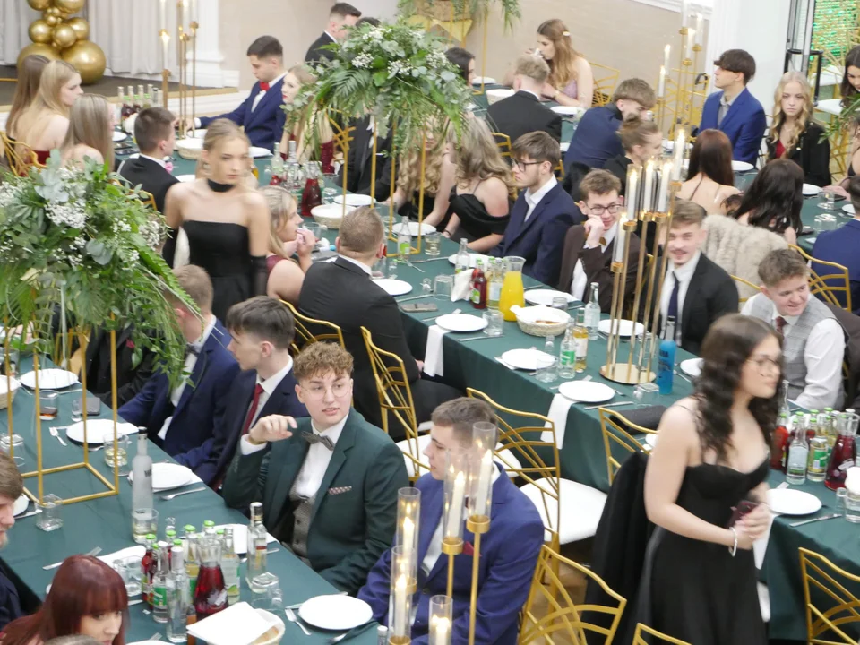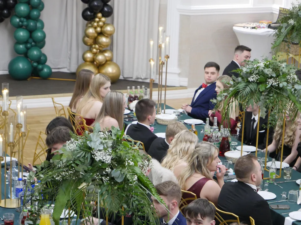 Tradycyjnie bal rozpoczął polonez, którego z dumą i skupieniem odtańczyło kilkanaście par maturzystów. Dostojny taniec wzbudził ogromne emocje i został nagrodzony gromkimi brawami. Piękne układy choreograficzne, pewność kroków oraz wspólne przeżywanie tej chwili podkreślały wyjątkowy charakter wieczoru.