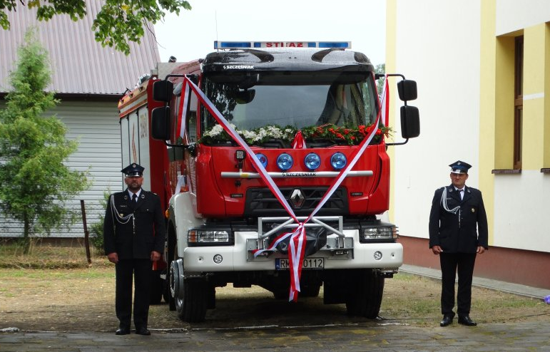 Uroczystego wręczenia dokumentów do samochodu i przecięcia wstęgi dokonali: wiceminister Marcin Warchoł, Komendant Powiatowy PSP Stanisław Rączka i Wójt Gminy Andrzej Głaz.