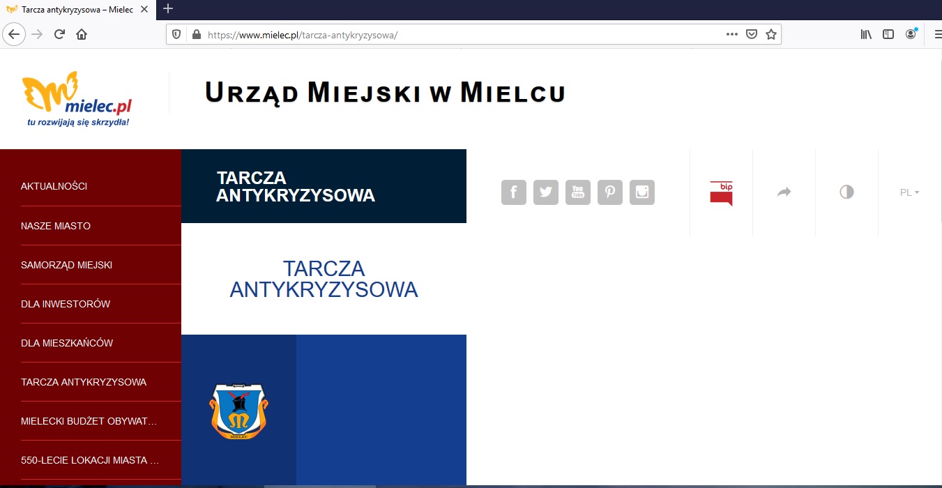 Rzeczywiście wchodząc na stronę Urzędu Miasta Mielca trudno znaleźć jakikolwiek odnośnik mówiący o tym w jaki sposób samorząd zamierza pomóc lokalnym firmom dotkniętym skutkami koronawirusa. Jedyny trop to widoczna po lewej stronie zakładka „Tarcza antykryzysowa”. Klikam w tę zakładkę i otwiera się dokument pod nazwą „Tarcza antykryzysowa – Instrukcja. Opracowanie dla biznesu”.