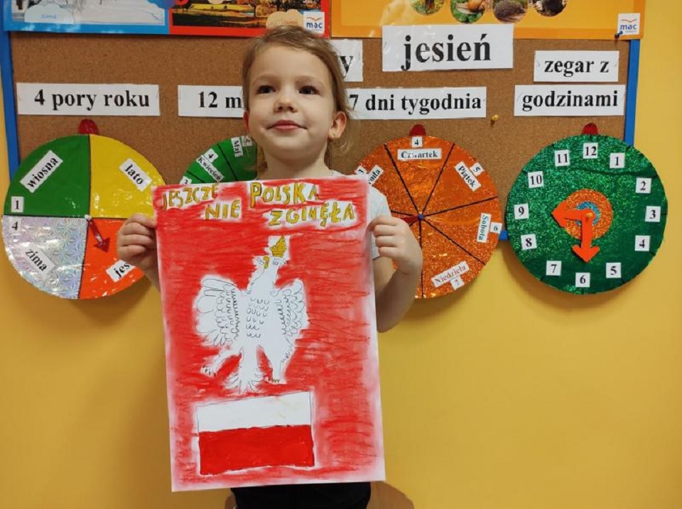 Ola narysowała pięknego orła – Godło Polski, flagę, a także samodzielnie napisała ozdobnymi literami pierwsze słowa Hymnu Polski: „Jeszcze Polska nie zginęła”. W dobie epidemii nagroda zostanie zwyciężczyni dostarczona przez organizatora drogą pocztową. Praca została wykonana pod kierunkiem nauczycielki Elżbiety Bator.