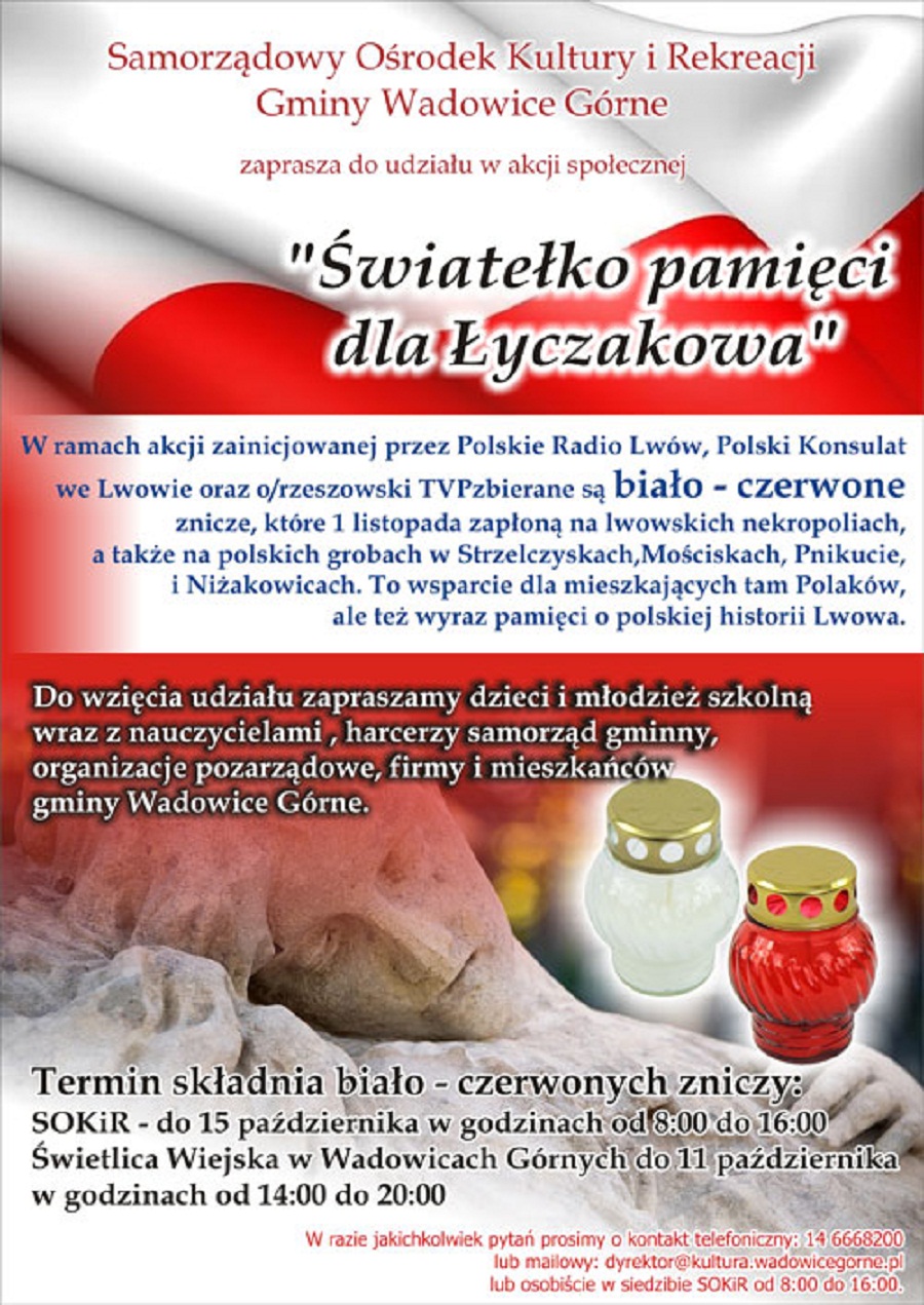 WiadomościSamorządowy Ośrodek Kultury i Rekreacji w Wadowicach Gónych zaprasza do udziału w akcji zbierania biało-czerwonych zniczy. Zapłoną one 1 listopada m.in na cmentarzach we Lwowie.