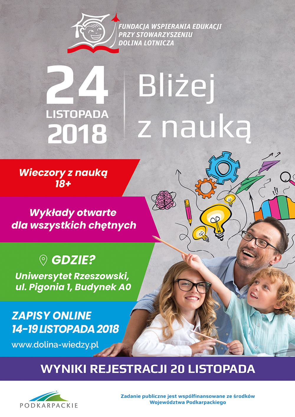 Udział w zajęciach jest bezpłatny i mogą rejestrować się wszyscy chętni z całego województwa Podkarpackiego. Zapisy odbywają się online poprzez link znajdujący się w aktualnościach na stronie internetowej Fundacji www.dolina-wiedzy.pl. Każdy wykład otwarty dla rodzin wymaga osobnej rejestracji, natomiast na Wieczory z nauką 18+ rejestracja odbywa się całościowo na dwie sesje. Rejestracja będzie aktywna od 14 listopada od godz. 10.00 do 19 listopada 2018 do godz. 23.59.59.