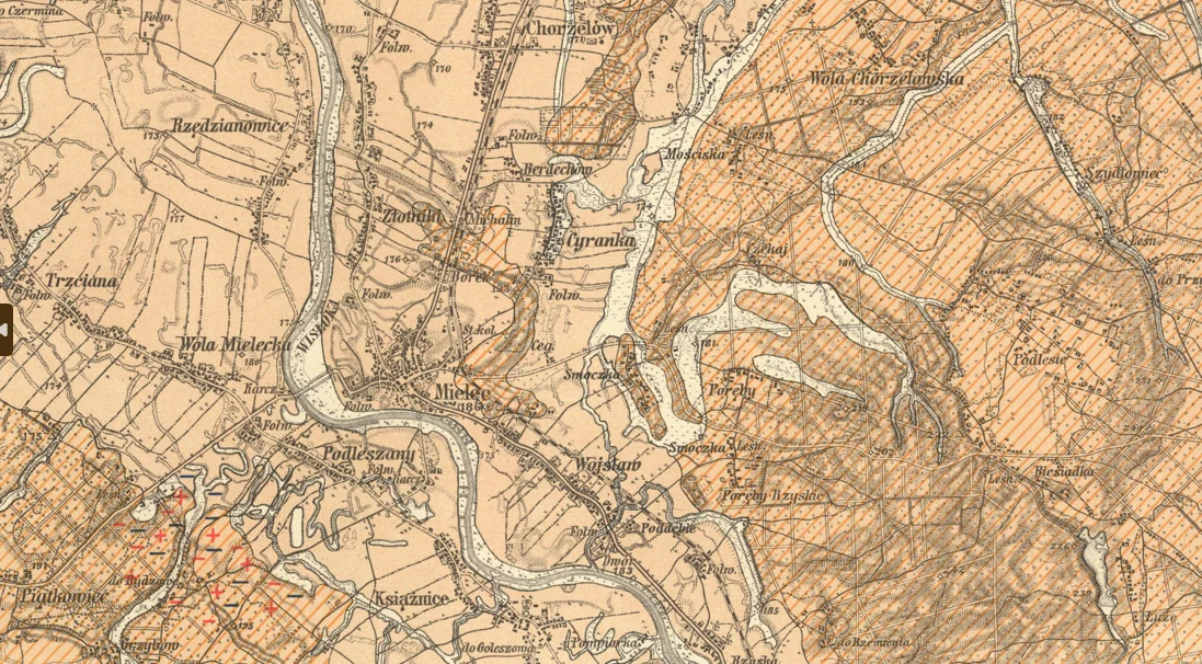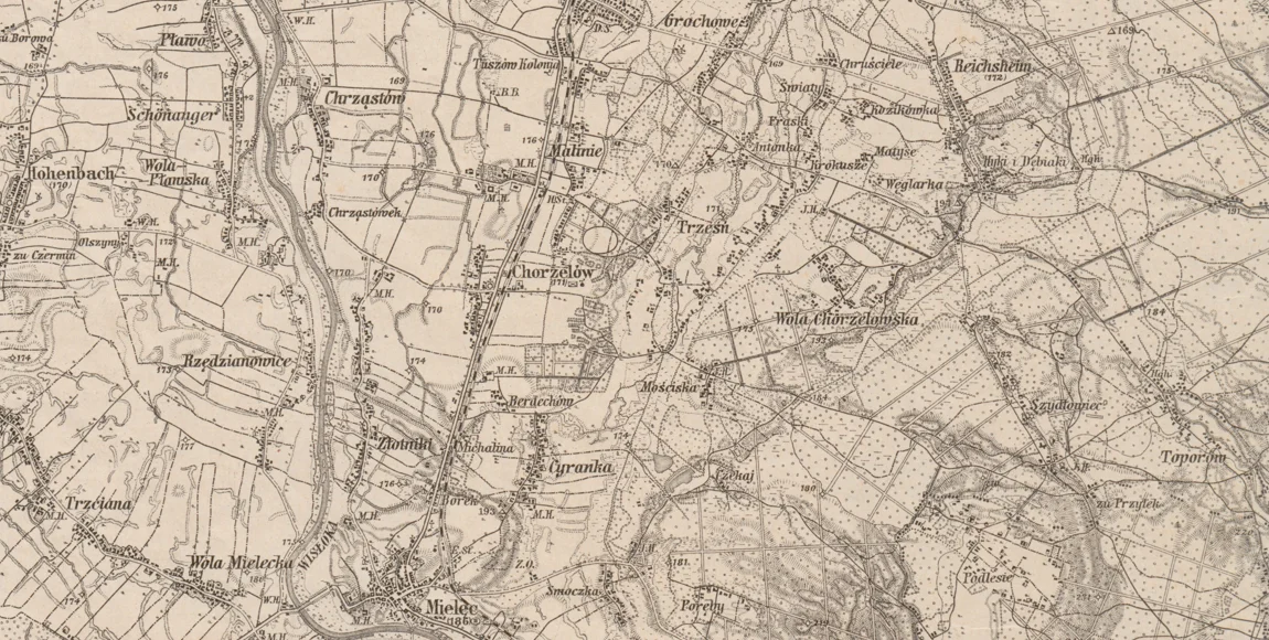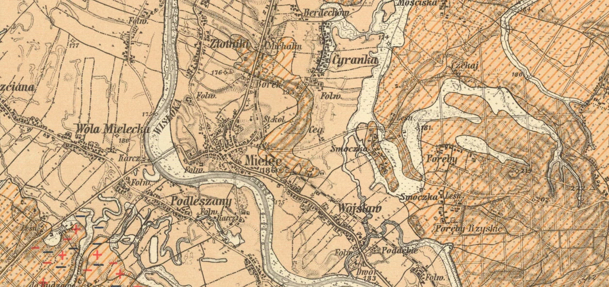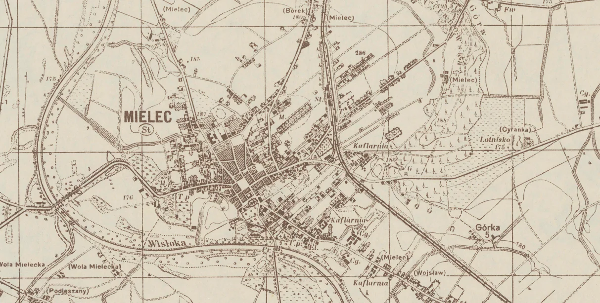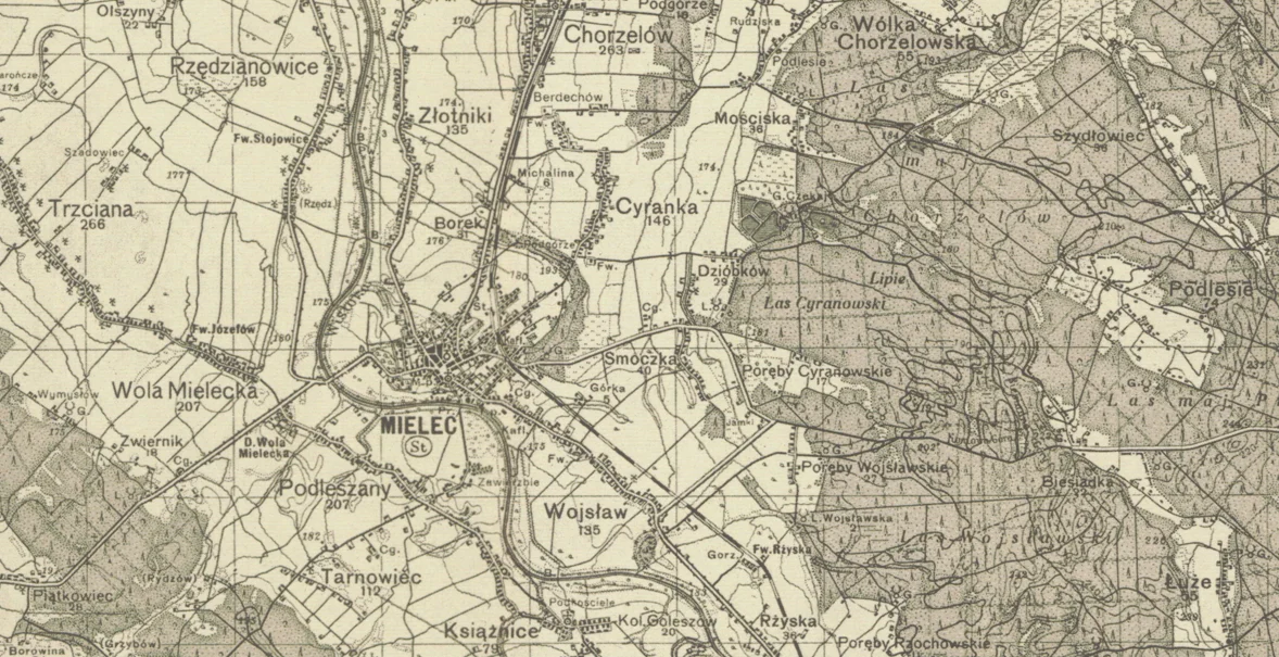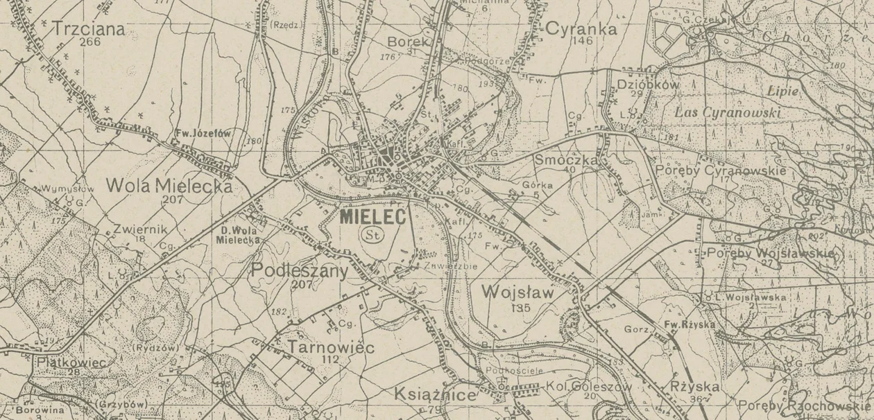 Z kolei mapy z przełomu XIX i XX wieku pokazują moment intensywnych zmian – powstawanie nowych dróg, mostów i linii kolejowych, rozwój Mielca jako ośrodka rzemieślniczego, a później przemysłowego. Widać na nich jeszcze w pełni wiejski krajobraz okolicznych gmin, zanim pojawiła się infrastruktura Centralnego Okręgu Przemysłowego i rozrastające się miasto wchłonęło sąsiednie wsie.