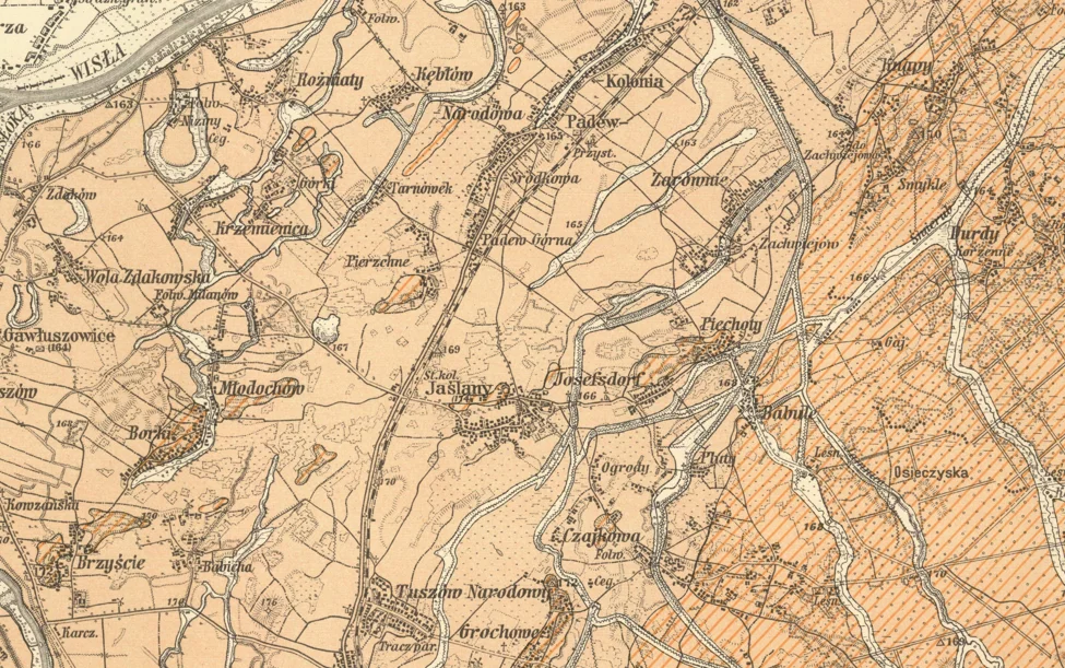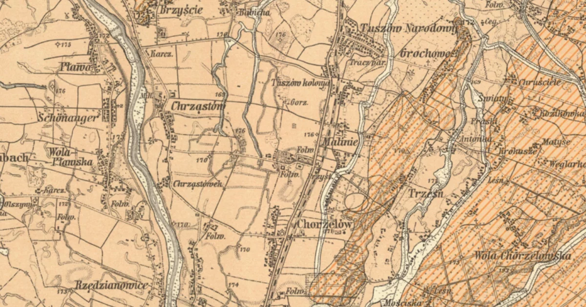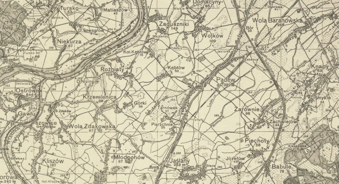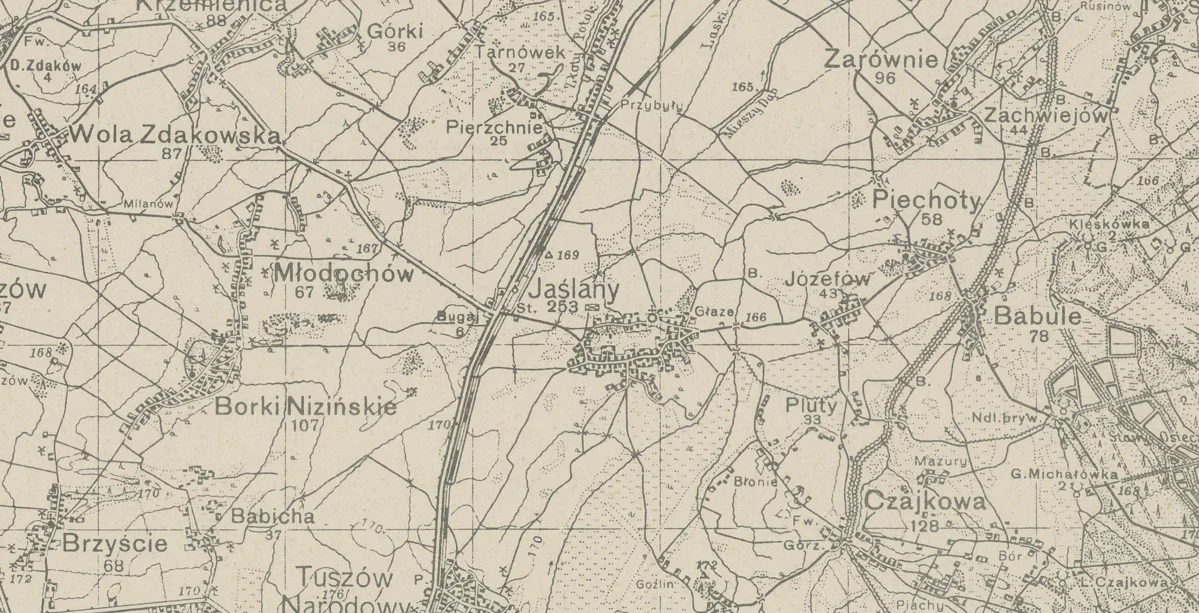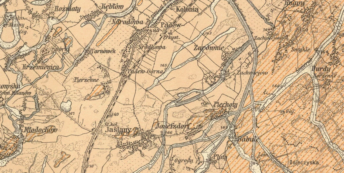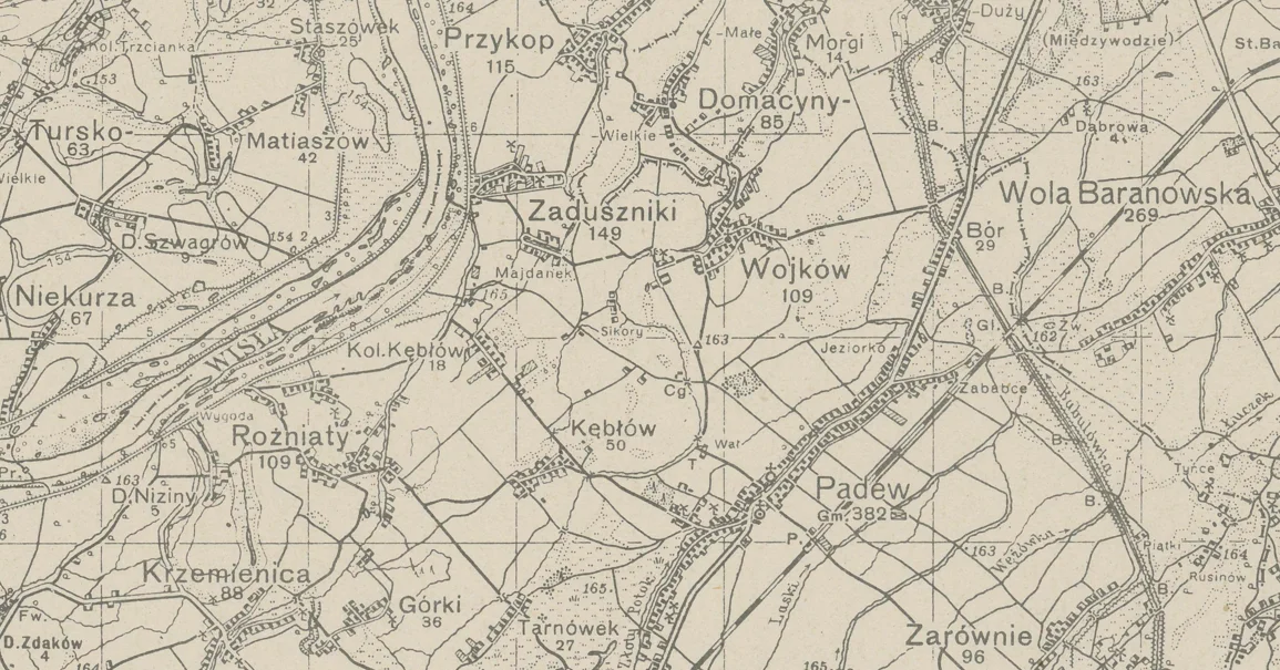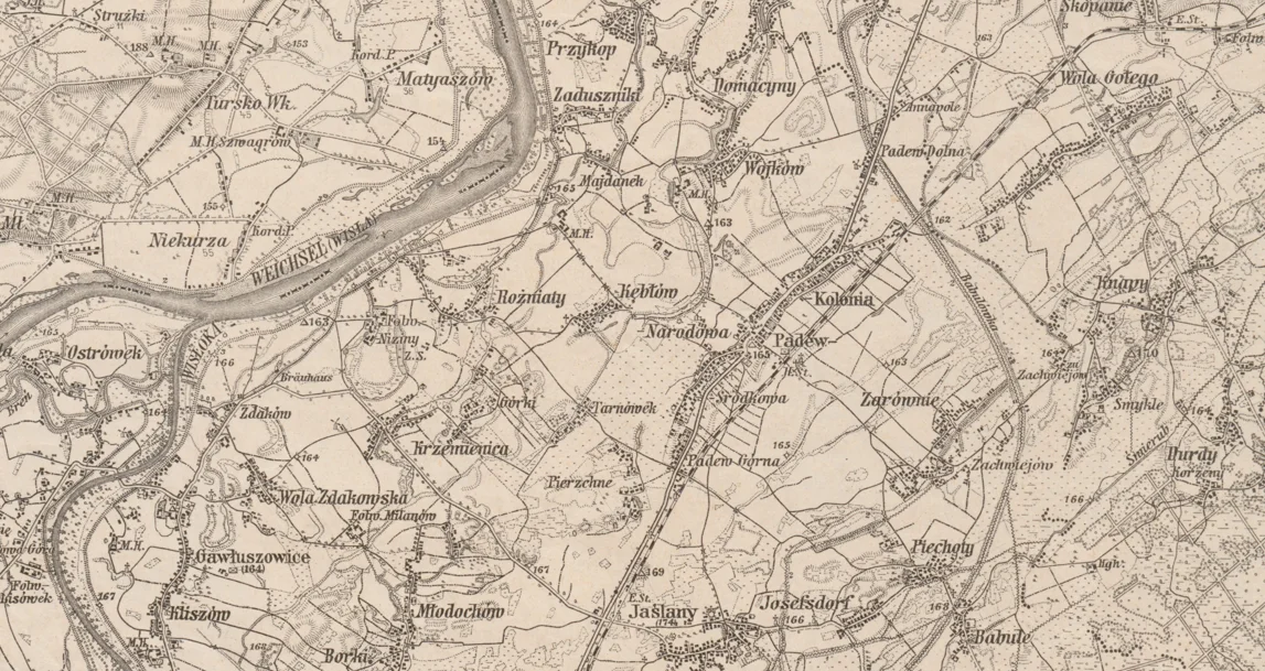Z kolei mapy z przełomu XIX i XX wieku pokazują moment intensywnych zmian – powstawanie nowych dróg, mostów i linii kolejowych, rozwój Mielca jako ośrodka rzemieślniczego, a później przemysłowego. Widać na nich jeszcze w pełni wiejski krajobraz okolicznych gmin, zanim pojawiła się infrastruktura Centralnego Okręgu Przemysłowego i rozrastające się miasto wchłonęło sąsiednie wsie.
