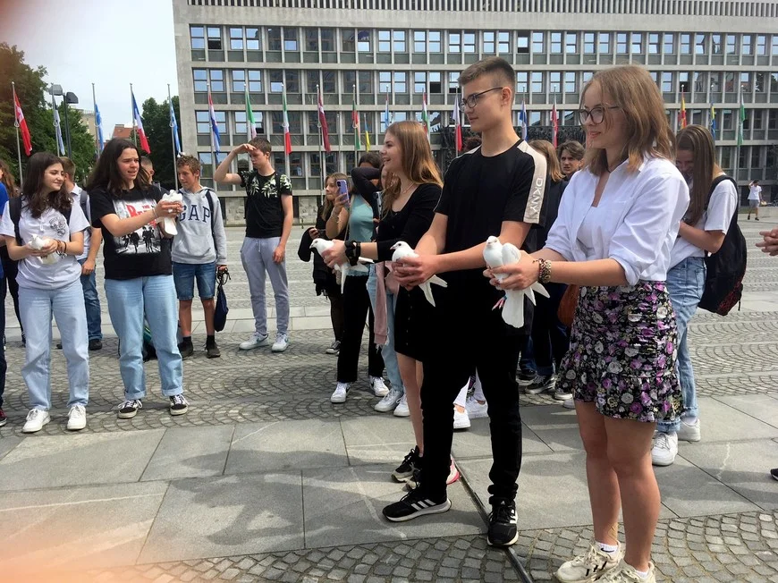Na placu przed parlamentem wypuścili gołębie pokoju w solidarności z Ukrainą.