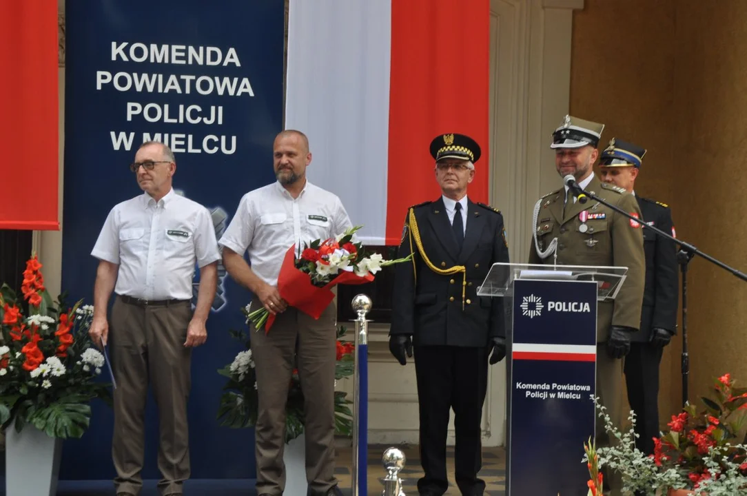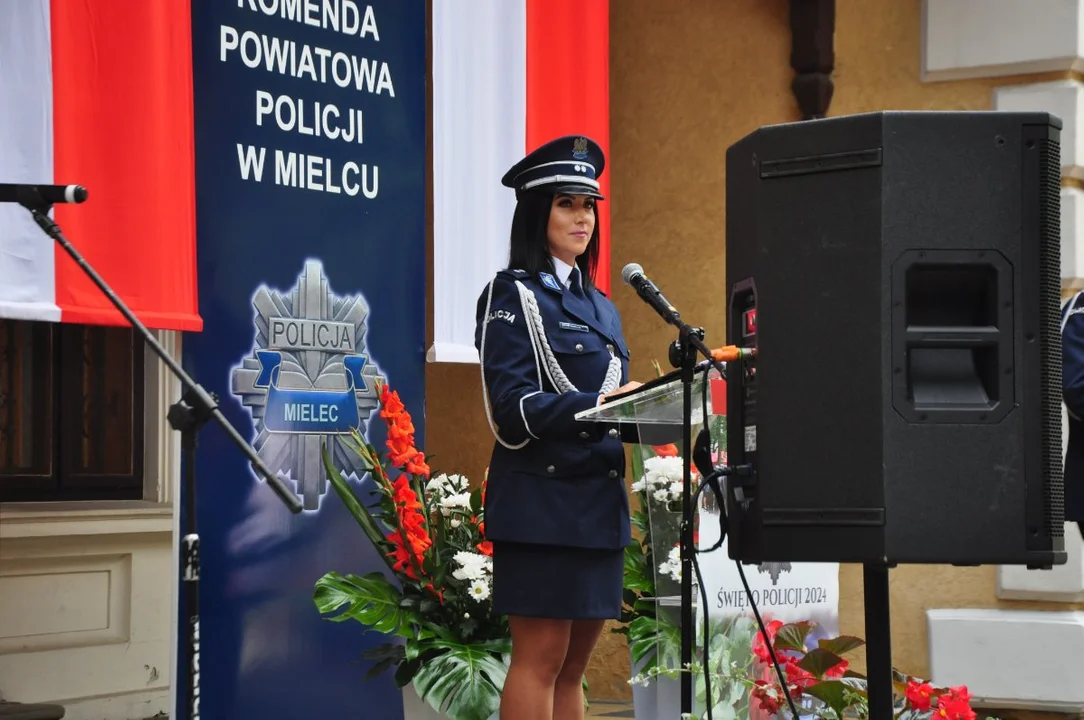 Po podniesieniu flagi państwowej na maszt i odśpiewaniu hymnu Rzeczypospolitej Polskiej, głos zabrał Komendant Powiatowy Policji w Mielcu mł. insp. Tomasz Grazda, który rozpoczął przemówienie słowami: "Już za kilka dni, dokładnie 24 lipca nasza formacja obchodzić 105 rocznicę powołania Policji Państwowej. Będzie to dla nas szczególny jubileusz jednak już dziś pragnę wyrazić serdeczne podziękowania i ogromne uznanie za trud pracy na rzecz niezwykle cennych wartości – życia, zdrowia i mienia oraz za bezcenną wartość jaką funkcjonariusze i pracownicy policji wnoszą w życie mieszkańców naszego powiatu to poczucie, że żyją w bezpiecznym kraju. Służba w Policji wymaga wielu poświeceń niejednokrotnie tych największych, to specjalny zawód dla wyjątkowych ludzi którzy w codziennym życiu przestrzegają zasad moralnych, są praworządni i mają nieposzlakowaną opinię. Służba wymaga od nas przede wszystkim wrażliwości i empatii na krzywdę drugiego człowiek, jego problemy oraz poszukiwanie sposobów i drogi do jak najszybszego i skutecznego ich rozwiązania."