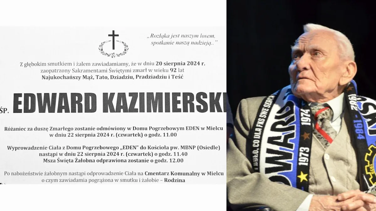 Edward Kazimierski odszedł 20 sierpnia 2024 roku w wieku 92 lat. Różaniec za duszę zmarłego odbędzie się w Domu Pogrzebowym "EDEN" w Mielcu w dniu 22 sierpnia 2024 roku (czwartek) o godzinie 11:00. Wyprowadzenie ciała do Kościoła pw. MBNP nastąpi o godzinie 11:40, a Msza Święta Żałobna rozpocznie się o godzinie 12:00. Po nabożeństwie żałobnym ciało zostanie odprowadzone na Cmentarz Komunalny w Mielcu.