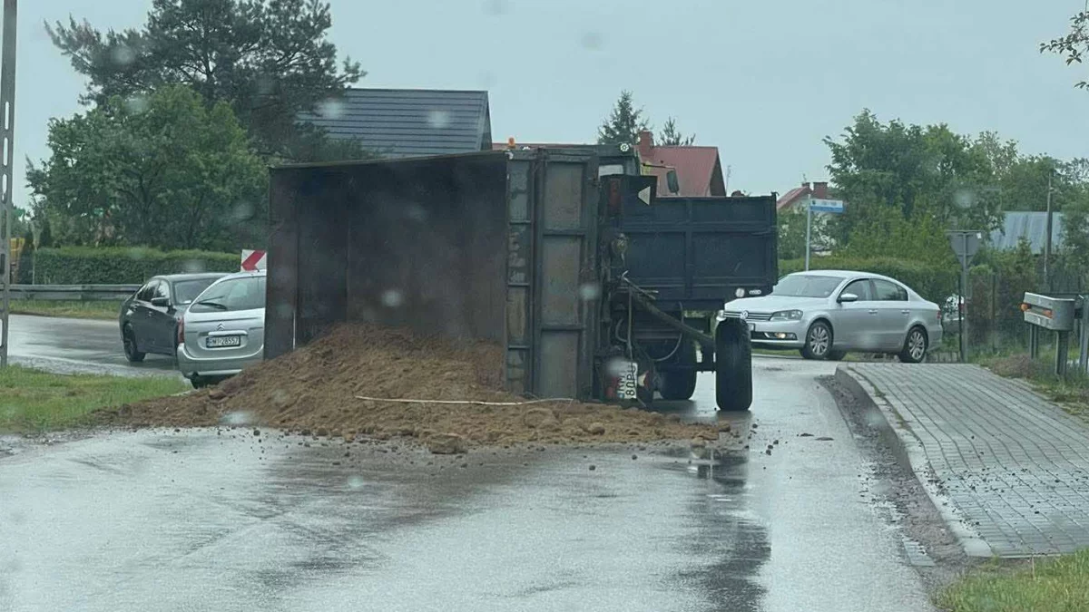 Na ostrym zakręcie przewróciła się przyczepa z ziemią, blokując częściowo jezdnię.