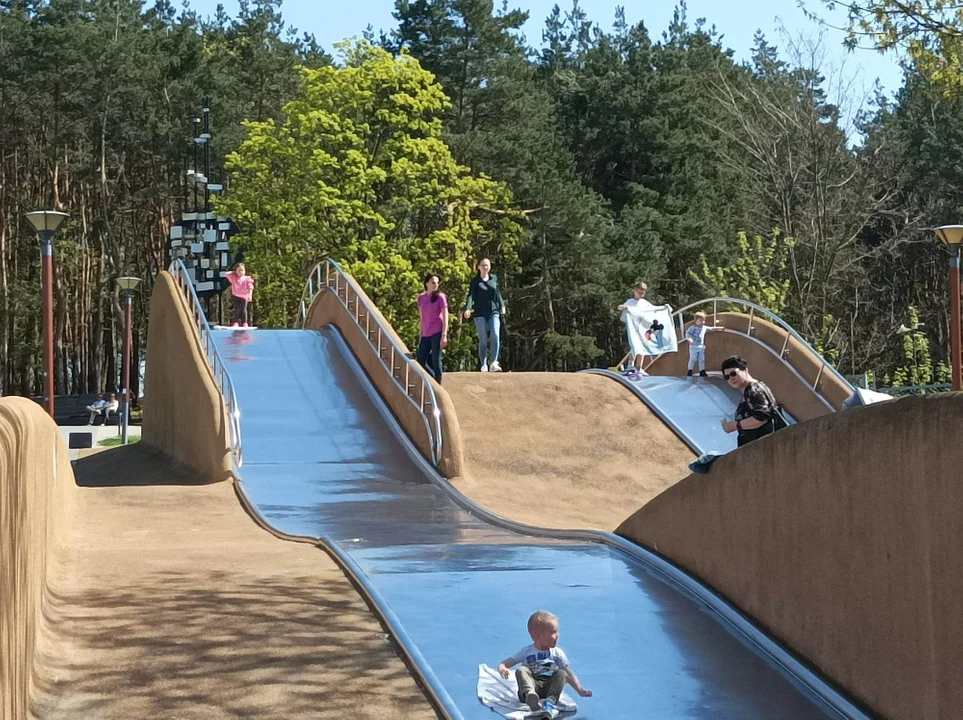 W zachodniej części parku znajdują się dwie zjeżdżalnie, plac zabaw z miękkim podłożem poliuretanowym, miniamfiteatr z siedzeniami oraz sztuczny potok, który wieczorem jest podświetlany niebieskim światłem, imitującym przepływającą wodę.