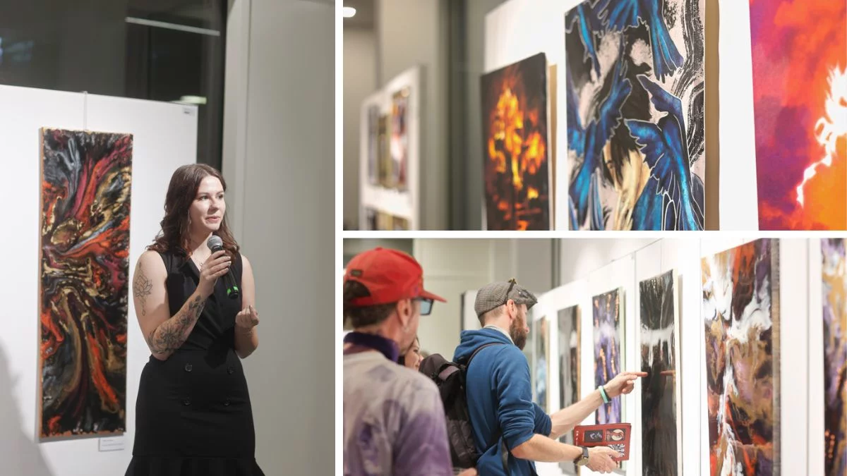 Po serdecznych słowach powitania i krótkim wprowadzeniu do tematyki wystawy dyrektor Strycharz oddała głos artystce. Klaudia Rzeźnik, 27-letnia twórczyni, opowiedziała zgromadzonym o swojej drodze do sztuki oraz inspiracjach, które stoją za prezentowanymi pracami. Z pasją mówiła o żywicy epoksydowej, która jest jej ulubionym medium.