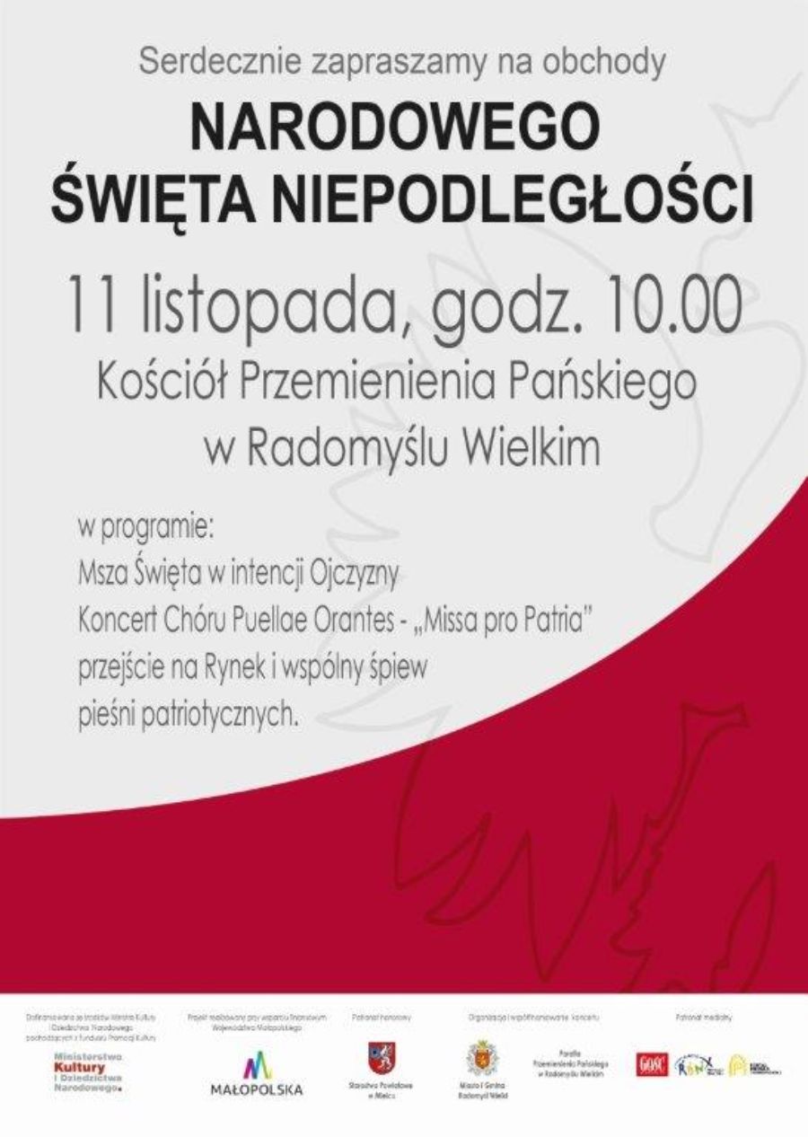 Z kolei 11 listopada obchody rozpoczną się one o godz. 10.00 w Kościele Parafialnym pw. Przemienienia Pańskiego w Radomyślu Wielkim Mszą Świętą w intencji Ojczyzny. Po niej odbędzie się koncert „Missa pro Patria” w wykonaniu Dziewczęcego Chóru Katedralnego „Puellae Orantes” z Tarnowa. Następnie zgromadzeni przejdą na rynek, gdzie o godz. 12.00. w ramach ogólnopolskiej akcji „Niepodległa do hymnu” odśpiewany zostanie „Mazurek Dąbrowskiego”. Obchody dopełni wspólny śpiew pieśni patriotycznych.