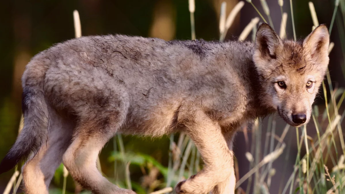 Wilcza matka, zwana przez niektórych „waderą”, niosła jedno ze swoich szczeniąt w pysku, a za nią podążały cztery kolejne.