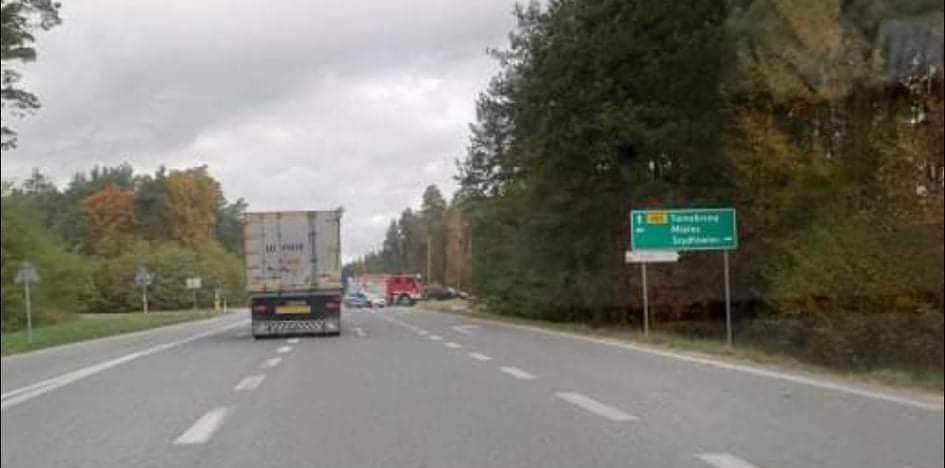 Na drodze pracują służby, ruch odbywa się wahdłowo.