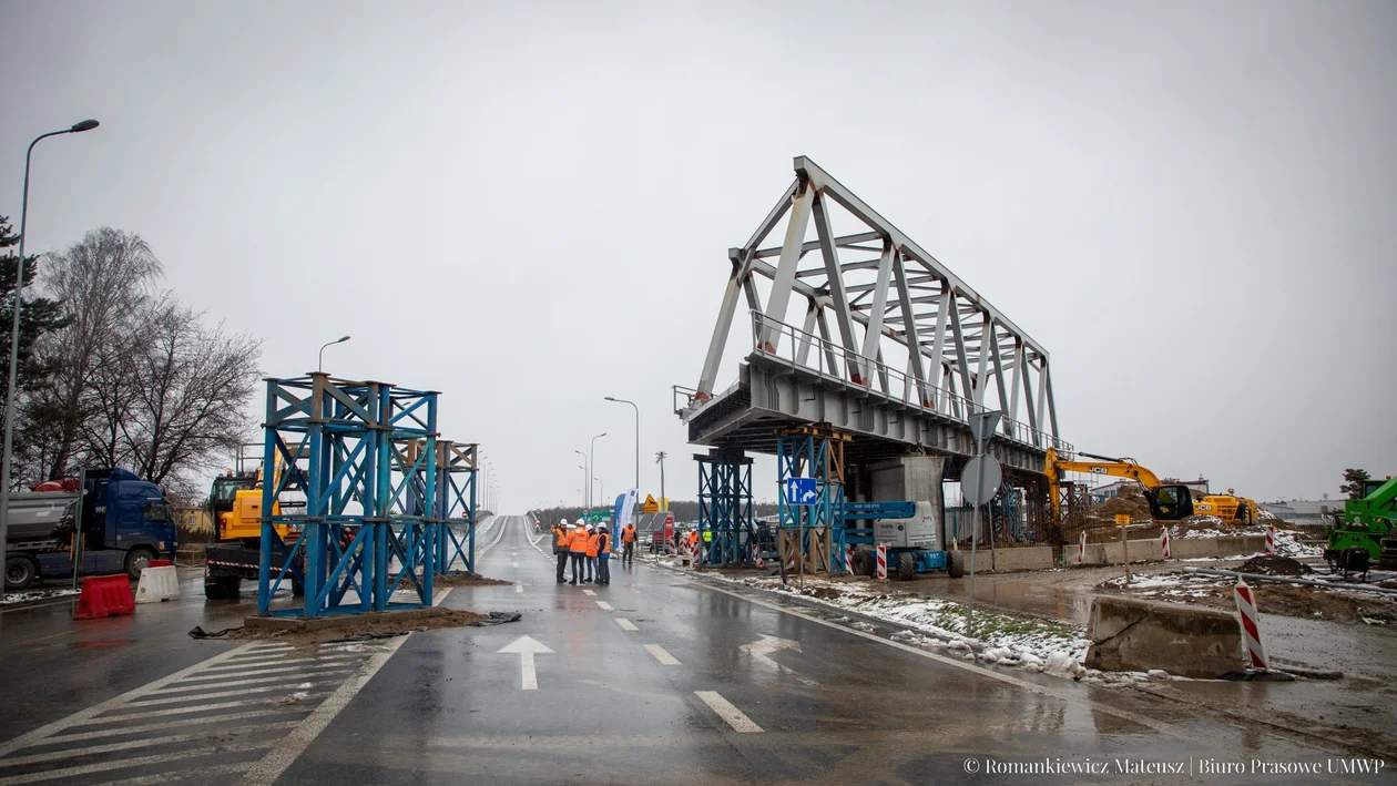 Prace przy budowie wiaduktu nad DK 9 rozpoczęły się już jesienią. Jednoprzęsłowy, stalowy obiekt o długości ponad 50 metrów, zapewni bezkolizyjny ruch pociągów na trasie do lotniska. Sprawna i bezpieczna będzie także komunikacja drogowa pod torami. Konstrukcja wiaduktu została przygotowana na tymczasowych podporach. Z końcem stycznia wykonawca rozpoczął nasuwanie obiektu na żelbetowe, docelowe przyczółki. Te prace przewidziano na kilka dni. Wymagane w tym czasie są zmiany w organizacji ruchu drogowego, zaplanowano od 30 stycznia do 13 lutego.