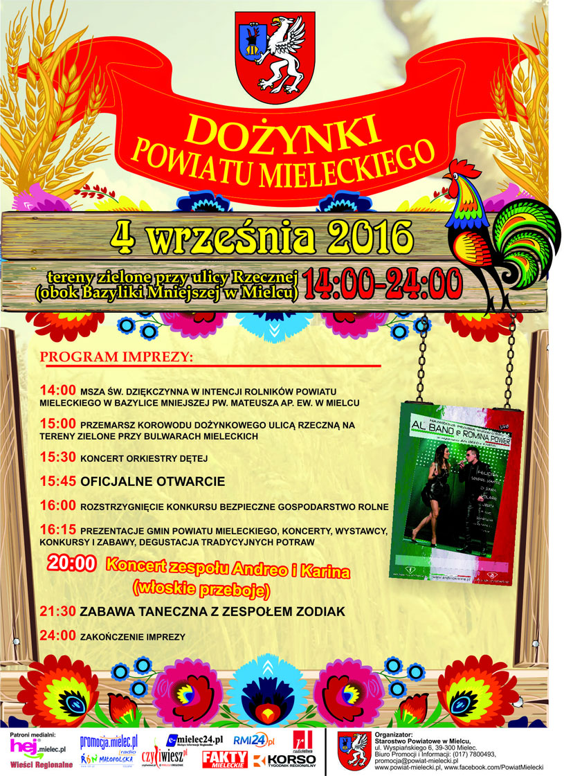 Tradycyjnie, uroczystości dożynkowe w powiecie mieleckim, których organizatorem jest Starostwo Powiatowe rozpocznie o godz. 14.00 msza św. dziękczynna w intencji rolników powiatu mieleckiego w Bazylice Mniejszej pw. Mateusza ap. ew. w Mielcu. O godzinie 15-tej Orkiestra Dęta poprowadzi korowód dożynkowy, który przejdzie ul. Rzeczną na tereny zielone przy bulwarach mieleckich. To właśnie tu nastąpi oficjalne otwarcie Dożynek powiatu mieleckiego.