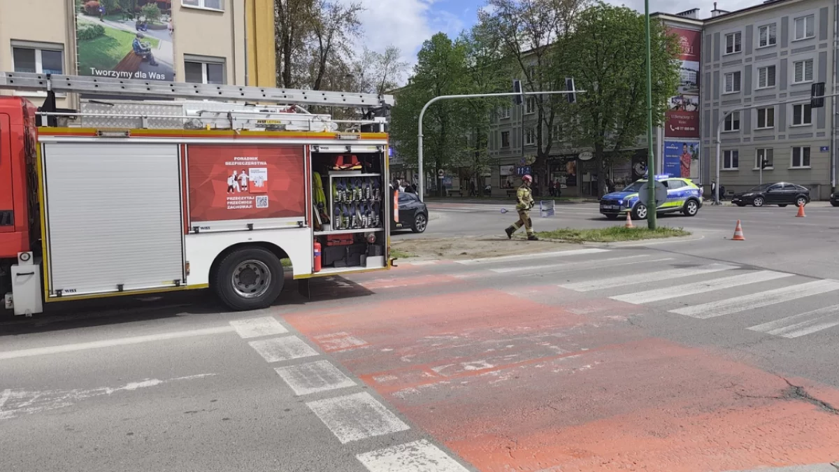 Uszkodzone samochody zostały już zepchnięte na chodnik, jednak na jezdni wciąż znajdują się fragmenty aut oraz ziemia. Służby porządkowe na bieżąco usuwają zanieczyszczenia i zabezpieczają miejsce zdarzenia.