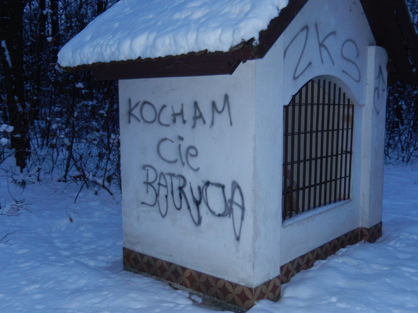 Do zniszczeń doszło w styczniu. Wieczorem wzburzony 20-latek pojawił się w nazwanym przez okolicznych mieszkańców „Lasku Siedmiu Boleści” i przy farbami nabazgrał obraźliwe napisy na sześciu z siedmiu kapliczek.