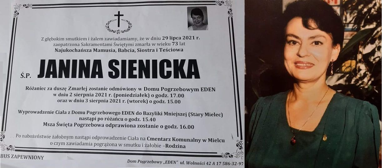 - 29 lipca 2021 odeszła od nas na zawsze moja przyjaciółka i "Rzeszowianka" Janina Sienicka.Janka była zawsze uśmiechniętą, chętną do pomocy, pozytywną i serdeczną osobą - informuje Jadwiga Klaus, instruktor i reżyser w Domu Kultury SCK w Mielcu.