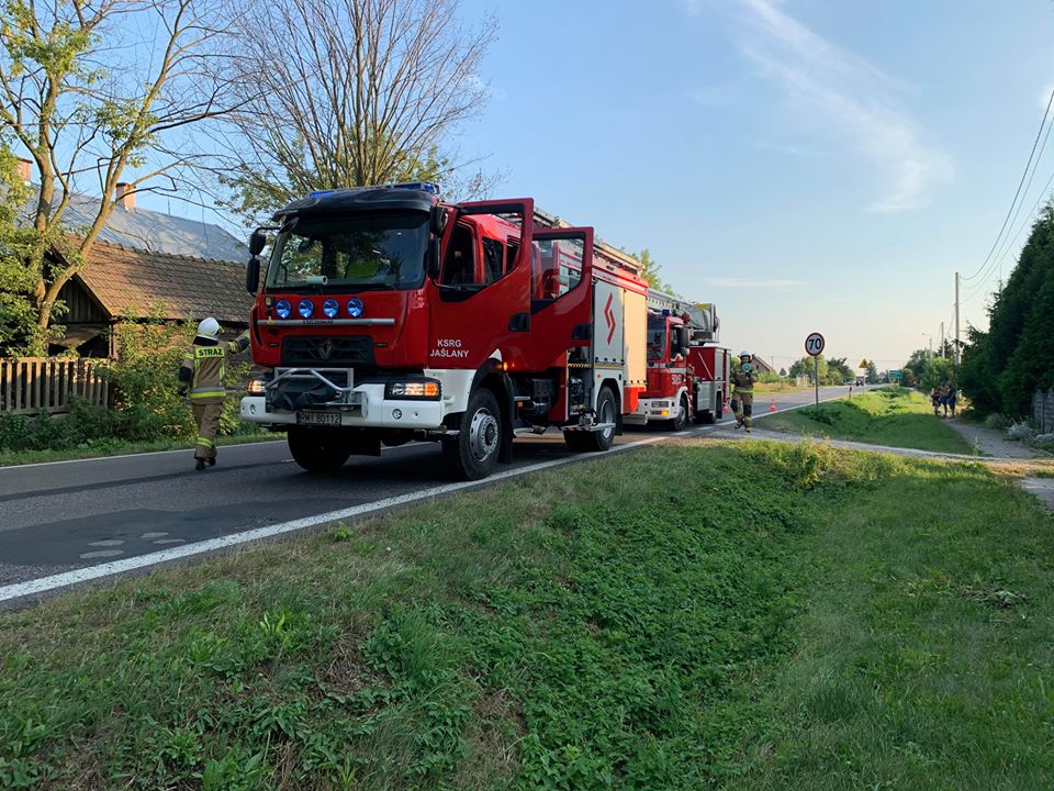 W akcji usuwania niebezpiecznego konaru zwisającego nad chodnikiem w Jaślanach udział brali strażacy z Jednostki Ratowniczo-Gaśniczej nr 2 z Mielca oraz OSP Jaślany.