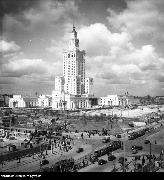 Budowa trwała dokładnie 1175 dni. Pałac zaprojektował Lew Rudniew, a Rosjanie plac budowy zaczęli organizować już w styczniu 1952 roku. Ściągnięto setki robotników i w maju rozpoczęły się w maju. Oczy całej Polski przez trzy lata były skierowane na plac budowy. Gazety informowały o postępach, wychwalano robotników i wskazywano przodowników pracy. O niektórych sprawach nie mówiono, jak np. o wypadkach śmiertelnych. Na budowie było 3 500 osób, a zginęło 16 robotników.